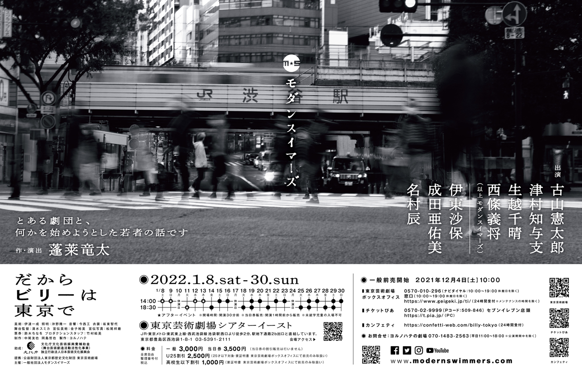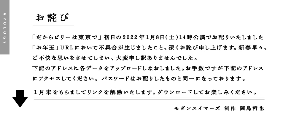 お詫び 「だからビリーは東京で」初日の2022年1月8日(土)14時公演でお配りいたしました「お年玉」URLにおいて不具合が生じましたこと、深くお詫び申し上げます。新春早々、ご不快な思いをさせてしまい、大変申し訳ありませんでした。下記のアドレスに各データをアップロードしなおしました。お手数ですが下記のアドレスにアクセスしてください。パスワードはお配りしたものと同一になっております。1月末をもちましてリンクを解除いたします。ダウンロードしてお楽しみください。 モダンスイマーズ 制作 岡島哲也 . ◉ダウンロードURL1|こちらをクリックしてください