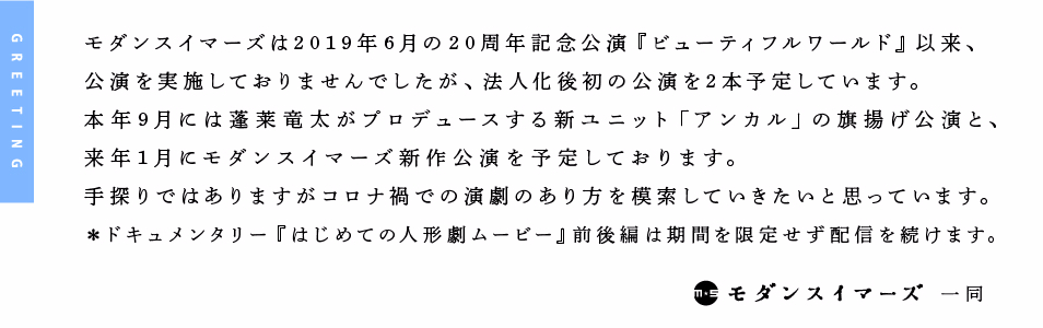 ■ 2019年モダンスイマーズ本公演「ビューティフルワールド」SPECIALコンテンツ|■ 2020年モダンスイマーズ本公演 舞台「しがらみ紋次郎(仮)」中止のお知らせ