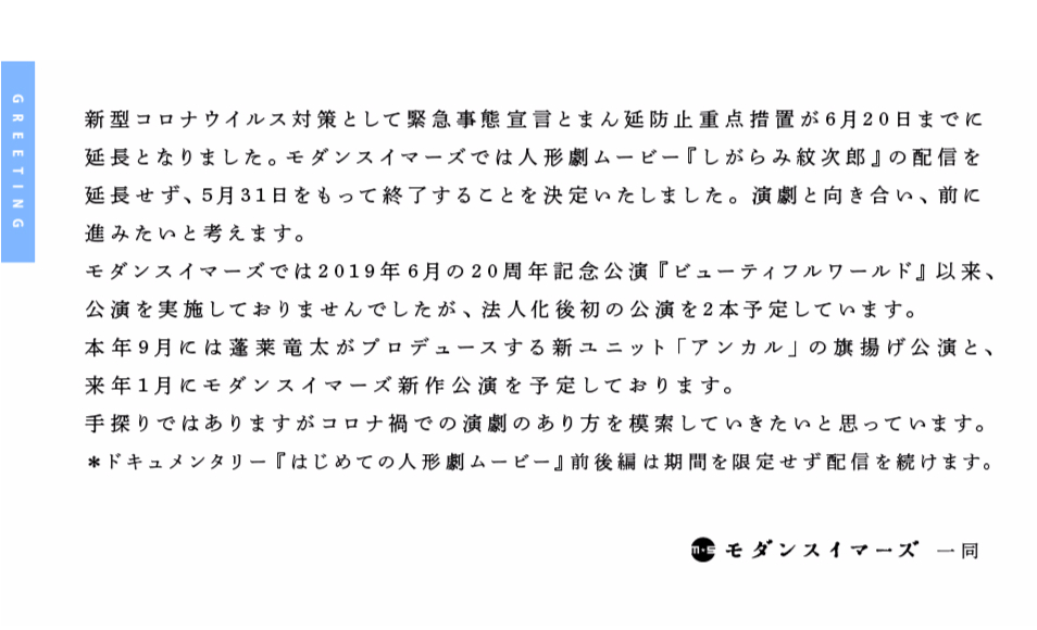 ■ 2020年モダンスイマーズ本公演 舞台「しがらみ紋次郎(仮)」中止のお知らせ