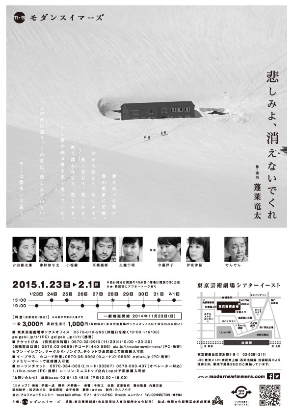 私は蓬莱の外部での作品をすべて観ているわけではないが、通常のプロデュース公演のセオリーから想像するに、主人公が無口であることは、必ずしも歓迎されない。また、『不毛ドライブ』で見せたような大胆なストイックさも、劇団以外の公演では実現が難しいのが実情だ。だから言いたい。華やかだったりドラマチックだったりするプロデュース公演の仕事で、蓬莱およびモダンスイマーズを判断している人がいたら、それはやめて、ぜひ劇団の公演を観てほしい。判断はそのあとで下してほしい。もしかしたら、昔のテレビドラマかと思うようなチープな設定から始まるかもしれない。でも、わかりやすさはそのままに、わざとらしさもお説教臭さもなく、あるところから感受性の細かいヒダに入り込む説得力を感じると思う。このところ年に1本あるかないかの劇団公演が1月23日から始まる。見逃してほしくない。